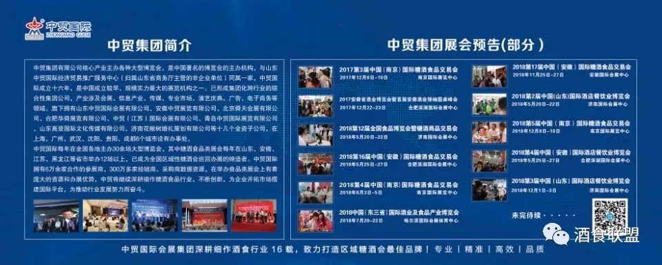中貿(mào)集團(tuán)2018年計(jì)劃將在山東濟(jì)南、安徽合肥、江蘇南京、黑龍江哈爾濱、浙江杭州等省市舉辦十余場次酒博會、食品展、餐飲展,形成聯(lián)動(dòng)招商、資源互動(dòng)和共享。